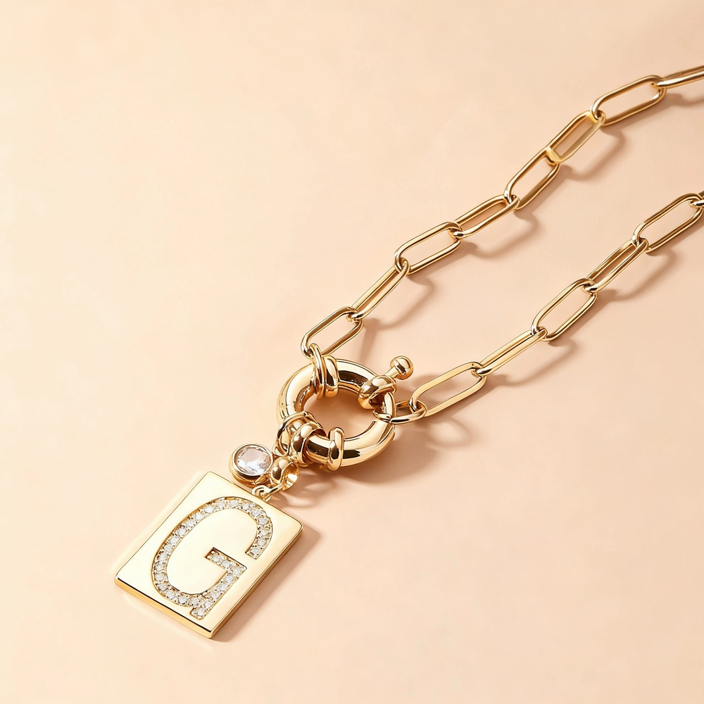 Un tocco personalizzato con un tocco moderno. Questo ciondolo con iniziale incastonata brilla su un'elegante catenina a graffetta, creando una perfetta combinazione di eleganza e tendenza. Indossatelo a strati o da solo per una dichiarazione di stile.